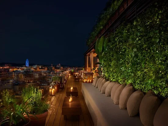 A Mediterranean terrace on the 10th floor of The Barcelona EDITION, offering another spot for stunning panoramic views of the city. Decorated with wooden parquet, plush sofas and sun beds in soft hues, the terrace here is charming and aesthetic - complete with aromatic plants and a vibrant bougainvillea contribute to the dimly lit garden atmosphere in the sky. It’s a secluded space which feels like a private garden party : chat to locals and tourists alike while hanging around the small urban outdoor pool with a spritz. For colder days, the glass sliding walls come to a close, so its the perfect year-round rooftop.