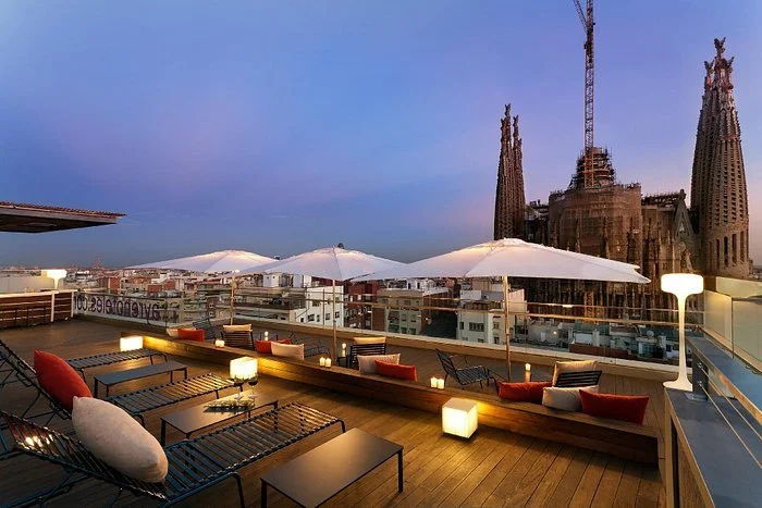 Located just a block from the Basilica of the Sagrada Familia, this is the top spot if you want to see jaw-dropping views of the the Sagrada Familia from a different perspective - one of the world's most photographed monuments (apparently). The terrace is very sleek and minimalistic, with only a few bar stools right at the edge of the terrace, and some comfortable lounge furniture dotted around so the space is never over crowded. It feels like a private viewing of the city from above. This terrace is unsurprisingly one of the most Instagrammable spots in the city, and beyond the basilica, the terrace offers panoramic 360° views of beautiful Barcelona. This spot is definitely a more intimate vibe - we think it would be perfect for date night.