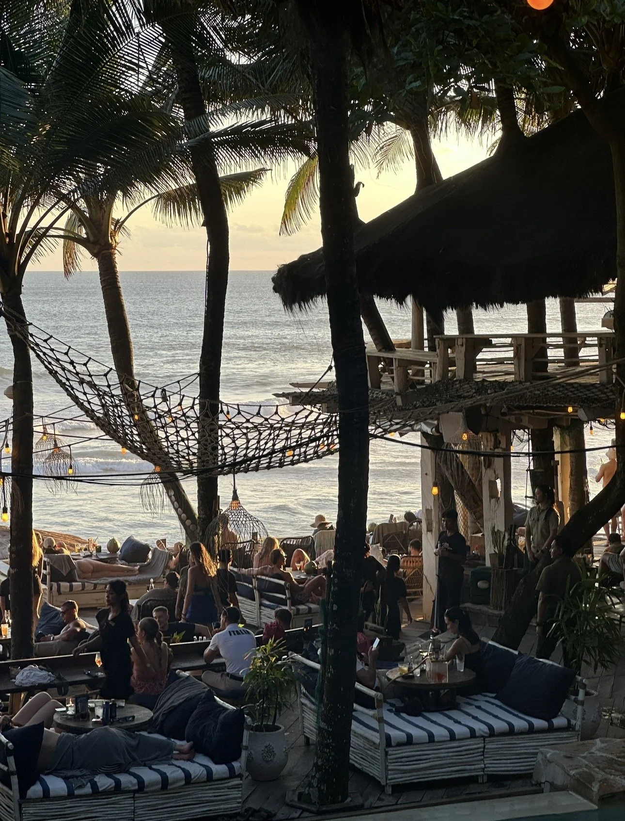 Canggu comes alive in the golden hour. Start at La Brisa, where driftwood textures, low lighting, and ocean views create one of the island’s most atmospheric sunset settings — it’s wild, rustic, and effortlessly photogenic. Just along the sand, The Lawn is a Canggu classic, ideal for early evening cocktails that turn into long, music-filled nights with the sea directly in front of you. For something sleeker, Café Kitsuné brings a Paris-meets-Tokyo cool to Bali, making it the perfect stop for a more fashion-leaning crowd before the night unfolds.